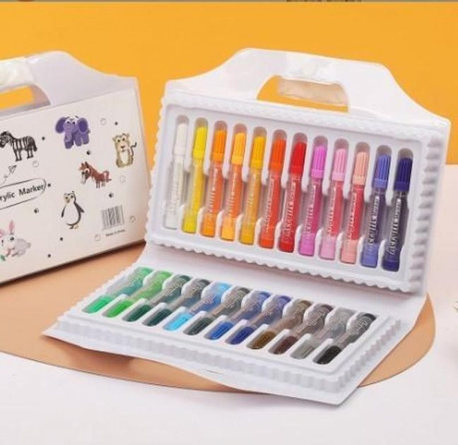 Набір акрилових маркерів MD 113, 24 кольори в кейсі — це набір яскравих і високоякісних маркерів, призначених для роботи з різними поверхнями. Вони ідеально підходять для малювання, розфарбовування, декорування та творчих проєктів на різних матеріалах, як-от папір, картон, дерево, тканина, скло, кераміка, камінь, метал та інші. Ці маркери мають водно-акрилову основу, яка забезпечує інтенсивність кольору, водостійкість, довговічність, а головне, вони повністю безпечні та можуть використовуватися дітьми. Вони швидко висихають, що дає змогу працювати швидше та уникнути розмазування малюнка. Кожен маркер має тонкий і гнучкий наконечник, який дає змогу контролювати товщину лінії малюнка, виділяти деталі та створювати різноманітні ефекти. Акрилові маркери також чудово змішуються між собою, що допомагає створювати нові відтінки та переходи кольорів. Вони можуть використовуватися як художні інструменти, а також для рекламних, дизайнерських і ремонтних робіт. Ними без проблем можуть малювати як професіонали, так і художники-початківці. Завдяки своїй універсальності та якості виготовлення акрилові маркери є незамінним інструментом для художників, дизайнерів, студентів і всіх, хто цінує творчість і якість роботи. Постачаються маркери в зручному, компактному та надійному пластиковому кейсі, що захищає їх від пошкоджень. І, завдяки якому маркери можна брати із собою куди завгодно.